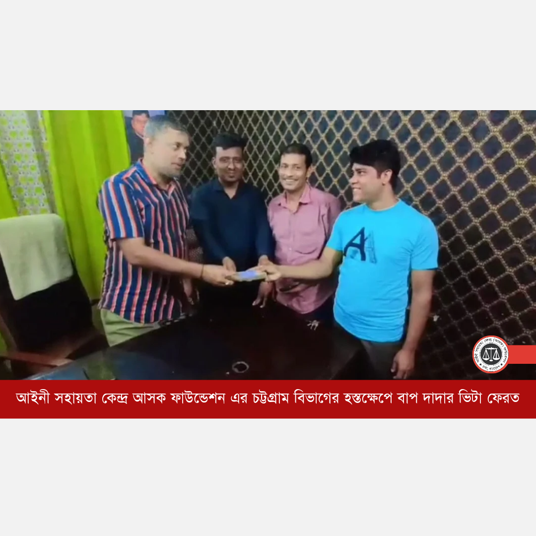 আন্তর্জাতিক মানবাধিকার সংস্থা আইনী সহায়তা কেন্দ্র আসক ফাউন্ডেশন চট্টগ্রাম উপপরিচালকের কার্যালয় আবেদনের পরিপ্রেক্ষিতে ৪১ নং সম্মানিত ওয়ার্ড কাউন্সিলর পুত্র জনাব ওয়াহিদুল আলম চৌধুরীর অফিসে সম্মিলিত প্রচেষ্টায় গোলবৈঠকে দীর্ঘ ১৭ বছরের সমস্যা সমাধানে সালিশী বৈঠকে জনাব ইকবাল হোসেন এর অভিযোগের প্রেক্ষিতে তার বাপ দাদার ভিটা ফেরত পাচ্ছে। এবং মামলা মোকদ্দমা খরচ দাবিকৃত টাকা বিবাদী নাজিরপাড়া নিবাসী জনাব মহিউদ্দিনকে বুঝিয়ে দেওয়া হচ্ছে।