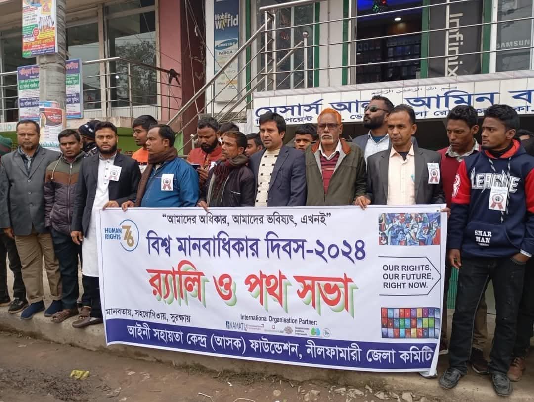 বিশ্ব মানবাধিকার দিবস-২০২৪ নীলফামারি জেলা কমিটির বর্ণাঢ্য র্যালি Aine Sohayata Kendro Asok Foundation
